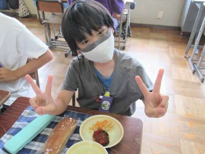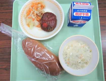 7/11(木) 今日の給食 公開日 2024/07/11 更新日 2024/07/11 旭東+(プラス) 今日のメニューは、黒ロールパン、牛乳、ハンバーグのトマトソースかけ、ニンジンのサラダ、コーンクリームスープでした。