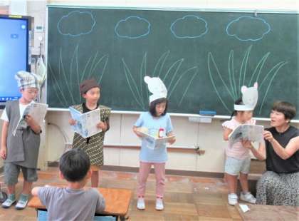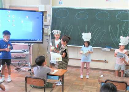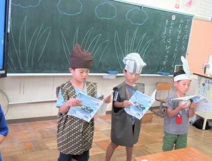 1年生の国語では、「おむすびころりん」の音読発表会をしていました。