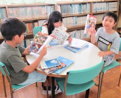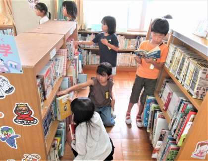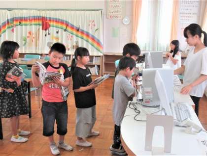3年生が、図書館で夏休みに読むための本を借りていました。