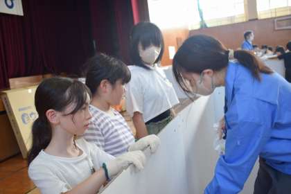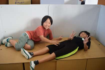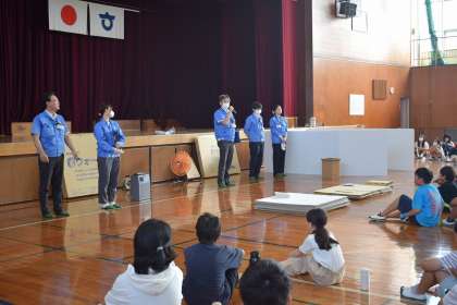 4年生〜6年生は、地域の企業である東明工業さんを招いて学習しました。避難所で使うベッドやトイレ、間仕切りを楽しく組み立てながら学習します。