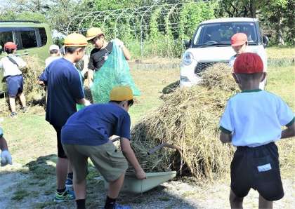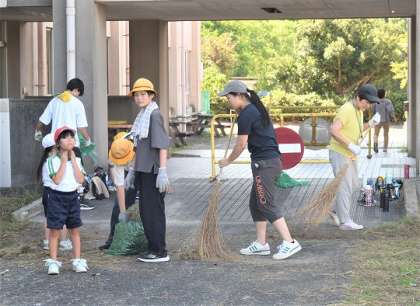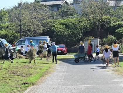 13日に地域・PTAの方々に刈っていただいた草を、児童たちがペアで活動しながら集めました。