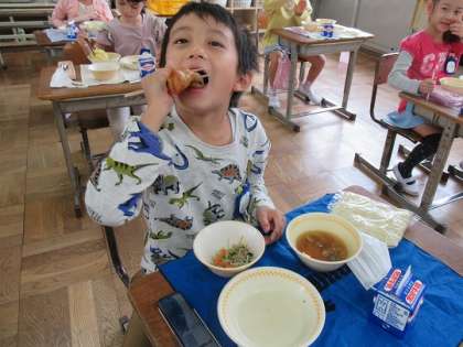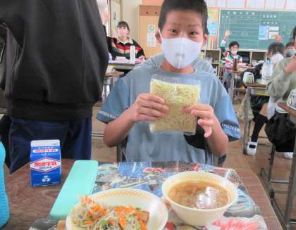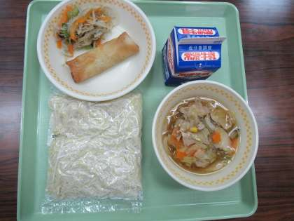 今日のメニューは、中華めん、牛乳、五目かけ汁、春巻き、野菜としらす干しのナムルでした。