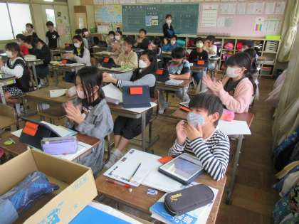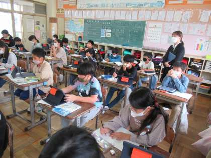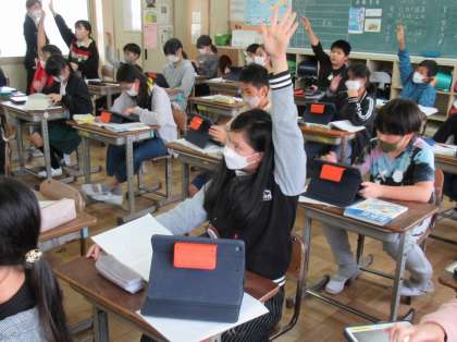 10/13(木) 面積 公開日 2022/10/13 更新日 2022/10/13 旭東+(プラス) 5年生の算数では、面積について学習していました。三角形の高さがどこなのか考えながら問題を解いていました。