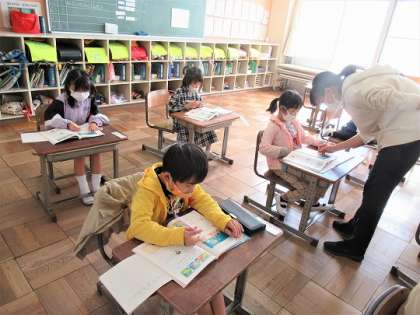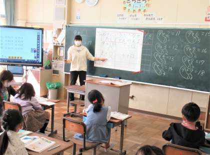 10/19(水) 9に足して 公開日 2022/10/19 更新日 2022/10/19 旭東+(プラス) 1年生の算数では、繰り上がりのある足し算を学習しています。今日は、9に1けたの数を足す学習です。