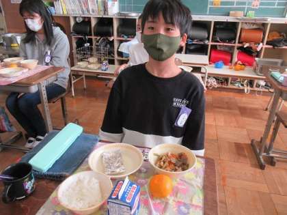 今日のメニューは、ご飯、牛乳、サバの銀紙焼き、筑前煮、みかんでした。