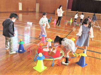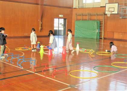 さまざまな道具を並べて、指定された場所にグループで作品をつくります。