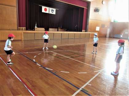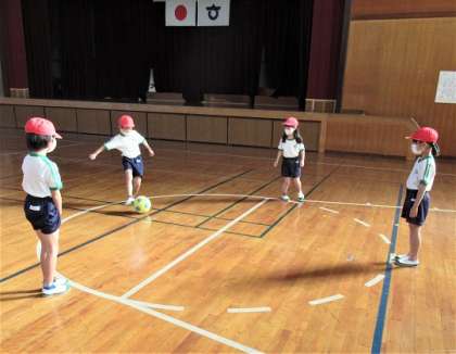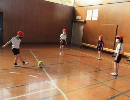 2年生の体育では、サッカーをしていました。思うように足を動かせるように練習しています。