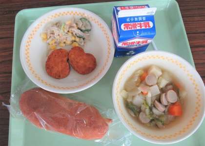 今日のメニューは、米粉入りパン、牛乳、大豆入りナゲット2個、ポトフ、ごぼうサラダでした。