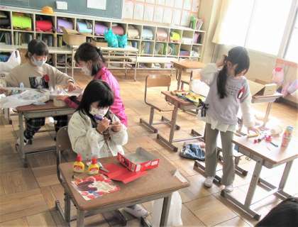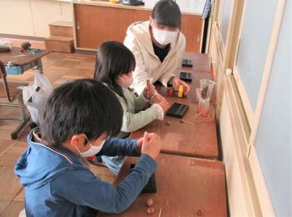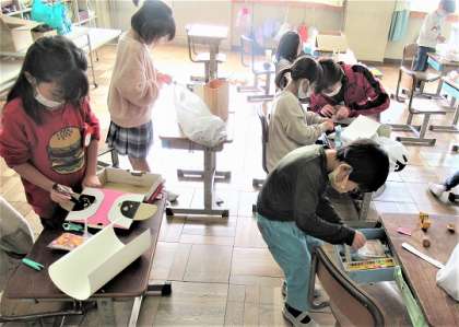 材料を使って、迷路、こま、マラカス、けん玉などを作っています。