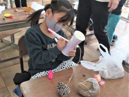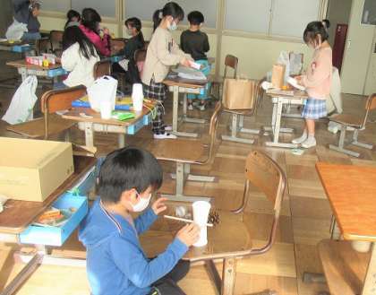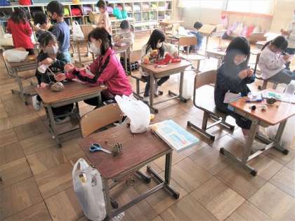 1年生の生活科では、旭公園で見つけた秋を使って、おもちゃづくりをしていました。