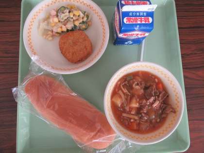 今日のメニューは、ロールパン、牛乳、レンコンサンドフライ、ツナサラダ、ビーフシチューでした。