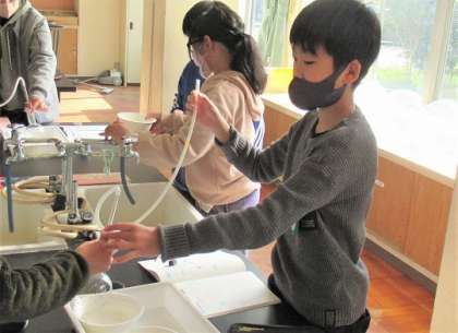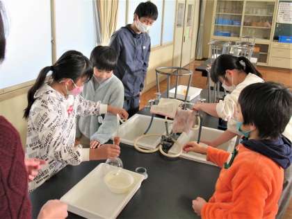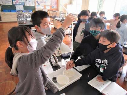 12/8(木) ゼリーの位置は 2 公開日 2022/12/08 更新日 2022/12/08 旭東+(プラス) 丸底フラスコとビニル管を、ゼリーを詰めたガラス管付きゴム栓でつないで空気を閉じ込めます。フラスコを湯につけたり氷水につけたりして、ゼリーの動きを観察していました。