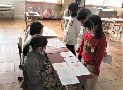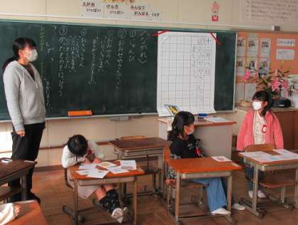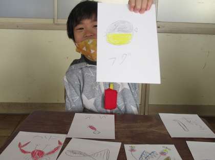 1年生の国語では、「おみせやさんごっこ」をしていました。ケーキ屋さん、魚屋さん、宝石屋さんなど、さまざまな商品を描いたカードを使って学習していました。