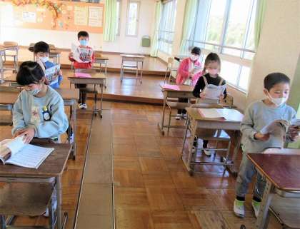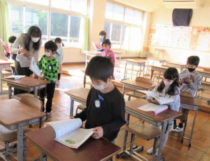 2年生の音楽では、「ねこだってサッカー」の歌唱練習をしていました。