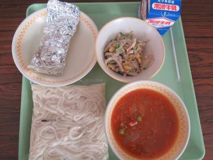 12/15(木) 今日の給食 公開日 2022/12/15 更新日 2022/12/15 旭東+(プラス) 今日のメニューは、ソフトめん、牛乳、ミートソースかけ、たら銀紙焼き、ごぼうとレンコンのサラダでした。