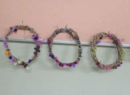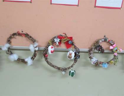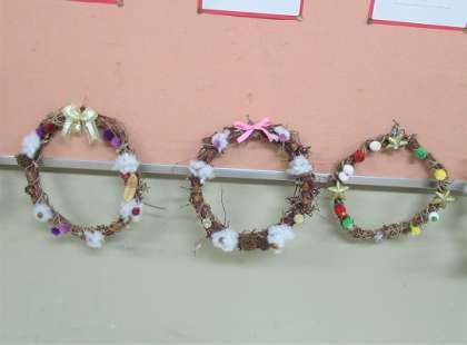 12/17(土) リース 公開日 2022/12/17 更新日 2022/12/17 旭東+(プラス) 1年生の生活科で作ったリースです。1学期に育てたアサガオの蔓を利用し、秋見つけで探したり家から持ってきたりした材料を使って、飾り付けをしています。