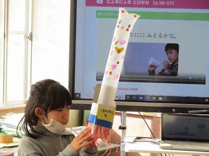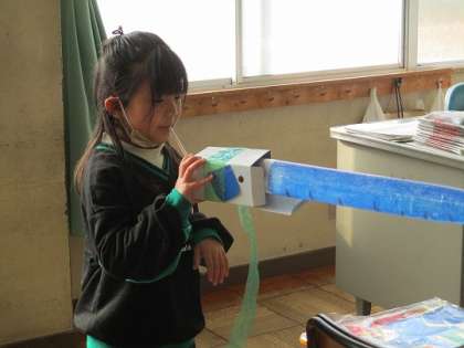ストローで息をふきこみ、箱の中から出てくるビニール袋と箱との変身を楽しみました。