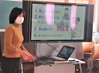 4年生が身体測定を行っていました。最初に養護教諭による保健指導を受けました。排便の大切さとこつの指導です。