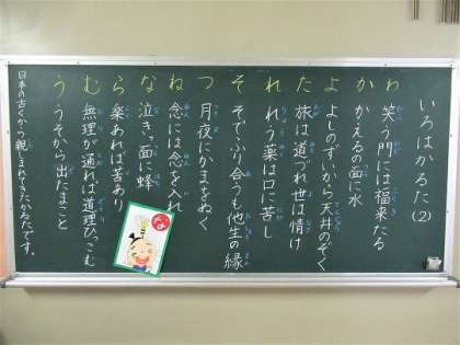 2階廊下の黒板が書きかえられていました。先週の「いろはかるた」の続きです。全部意味がわかるでしょうか。