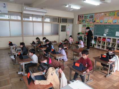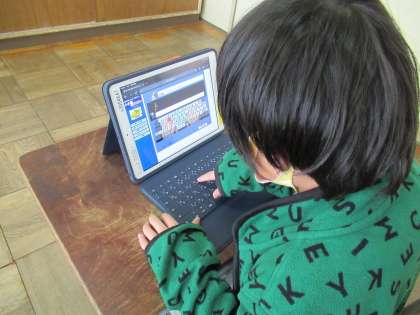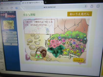 1年生の情報教育の授業です。「キーボー島アドベンチャー」という小学生の情報教育のために開発されたアプリを使って、楽しくタイピング練習が進められていました。