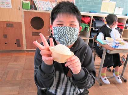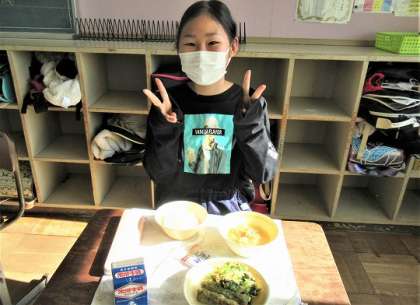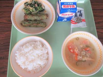 1/19(木) 今日の給食 公開日 2023/01/19 更新日 2023/01/19 旭東+(プラス) 今日のメニューは、ご飯、牛乳、ちくわの磯辺揚げ2個、エリンギと青菜のごま和え、ジャガイモ入り呉汁、乾燥小魚でした。