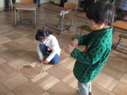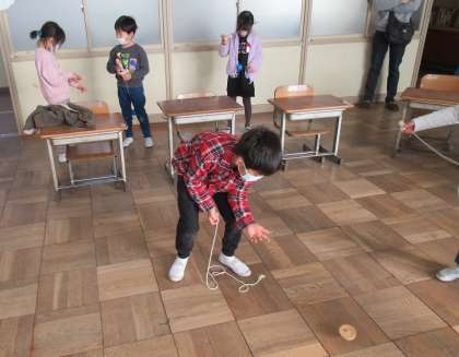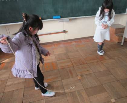 自分が選んだ昔の遊びの中から、けん玉、あやとり、お手玉、こまの順に発表します。