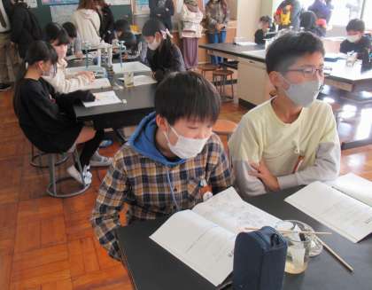 今日は、実験で砂糖が水に溶ける様子を観察し、考えていました。