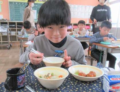 メニューは、ご飯、牛乳、ごぼう入りつくね2個、豚肉と大根の煮物、キャベツのゆかり和えでした。