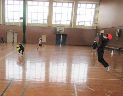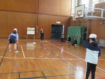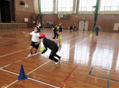 体育館で床に置いたコーンをベースに見立てて、ゲームをしていました。