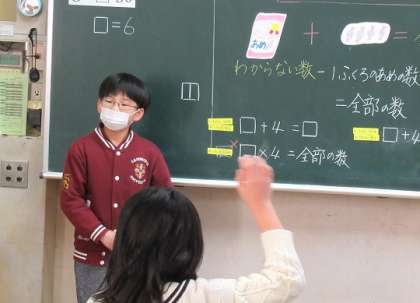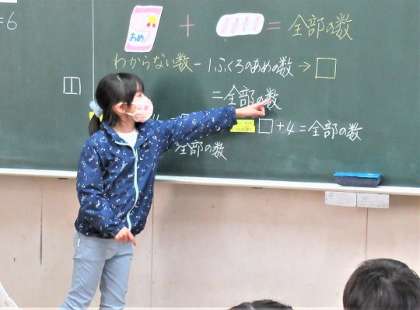 2/15(水) 式にしよう 2 公開日 2023/02/15 更新日 2023/02/15 旭東+(プラス) 1ふくろにあめがいくつ入っているかがわからない状態で、あめを加えたり食べたりした場合の式を考えていました。