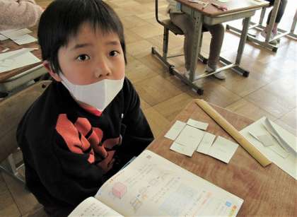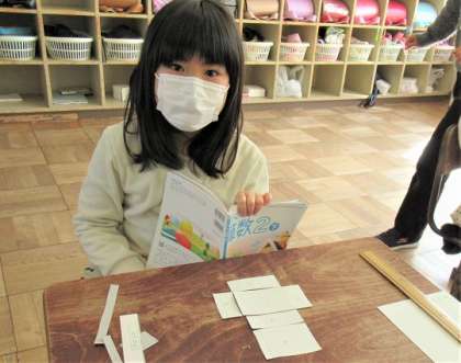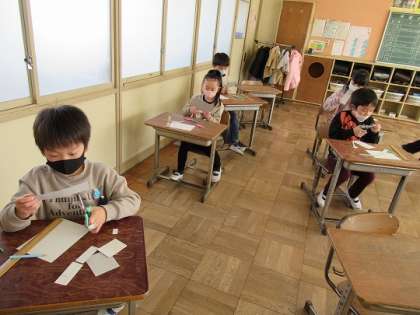 箱に必要な面を書いて、切り取っていました。できた人は、どう貼り付けたらよいかを考えています。