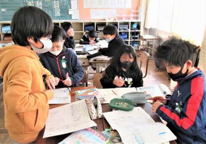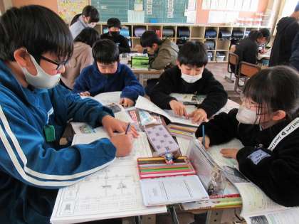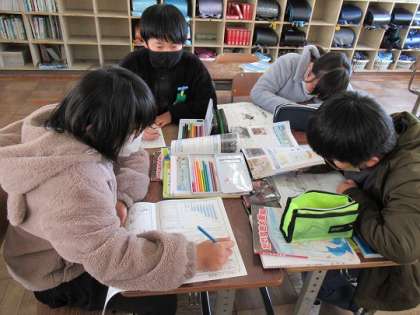 4年生の社会では、テストに向けてグループでの学習をしていました。黒板には、「4年生の社会の学習をかんぺきにしよう」の文字が。