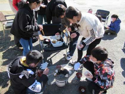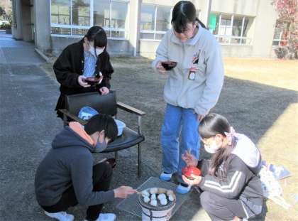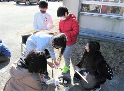 炊いたご飯を七輪の上に。林間学校で料理ができなかったので、楽しそうです。