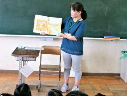 今日は1年生から4年生までで読み聞かせをしていただきました。皆、お話に引き込まれて聞いていました。