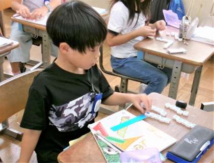 10/8(火) かけ算 2 公開日 2024/10/08 更新日 2024/10/08 旭東+(プラス) 1台5人ずつ乗れるジェットコースターの台数が増えていくとき、乗れる人数を数図ブロックを使って考えていました。