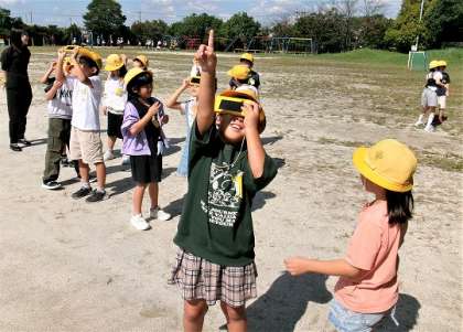 みんなで運動場に出て、遮光板を使い、太陽の位置と影の位置を確認していました。