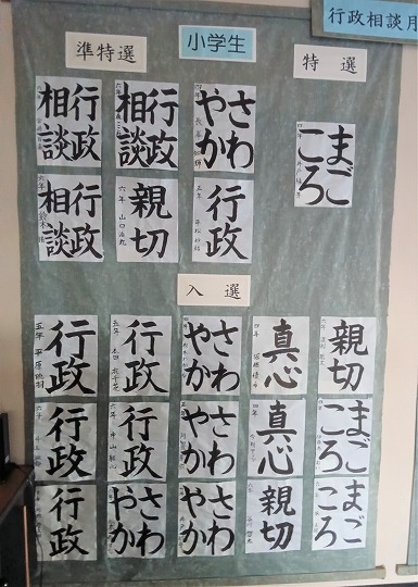 市役所1階に行政相談月間入賞作品(習字)が展示されていました。本校児童の作品もありました。がんばりました!