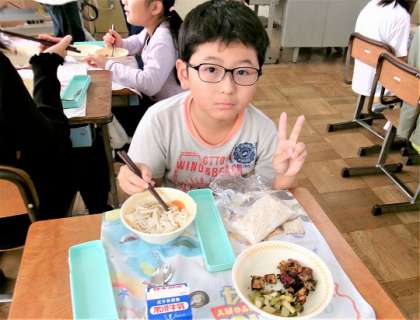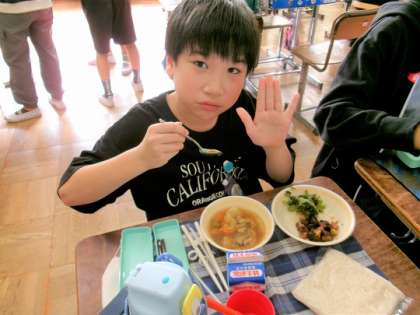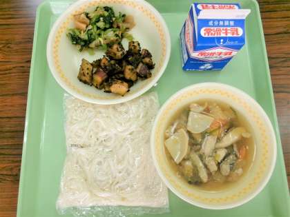 今日のメニューは、ソフトめん、牛乳、和風かけ汁、大学芋、エリンギと青菜の和え物でした。