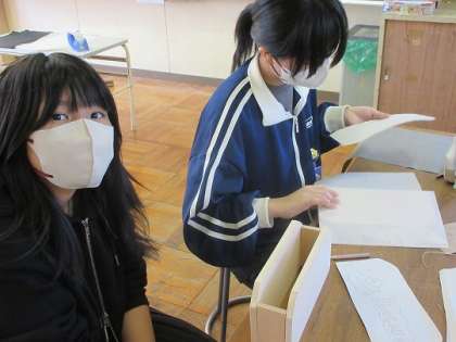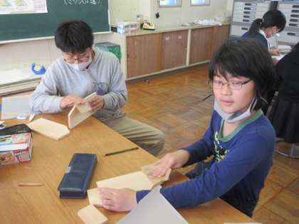 テープカッターづくりをしています。 電動糸ノコで板を切り、側面の絵を描いています。