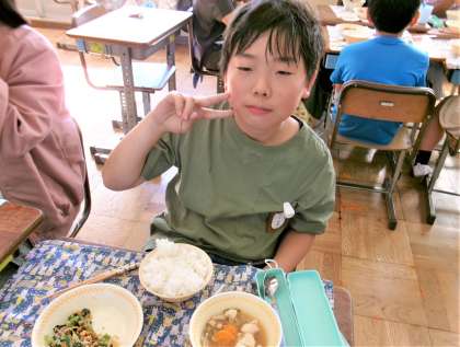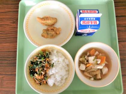 今日のメニューは、ご飯、牛乳、白身魚(鱈)のフリッター2個、ビビンバ、ピリ辛汁でした。
