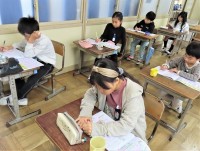 5年生は台形の面積について学習中。 図形をずらし、上底や下底、高さなどを確認しながら取り組んでいます。