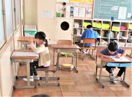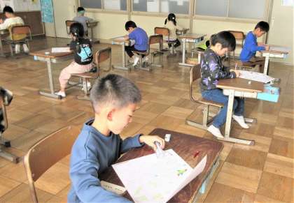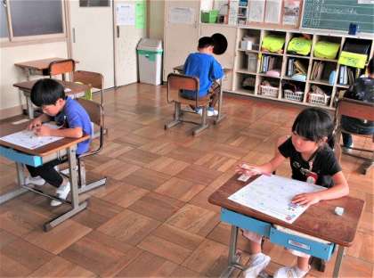 テストになれていない1年生は、うなりながら問題に取り組む児童も見られます。