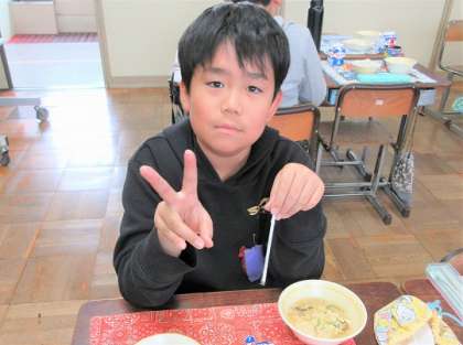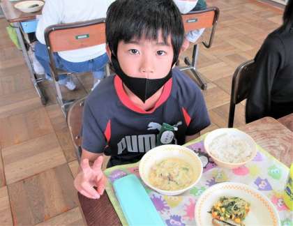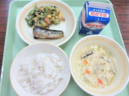 今日のメニューは、麦ご飯、牛乳、イワシの梅煮、野菜のごま和え、かき玉汁でした。