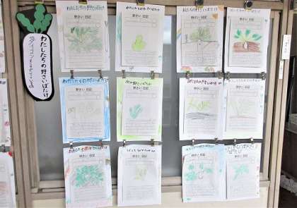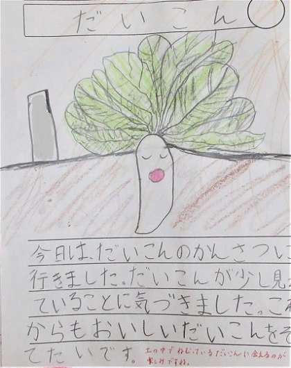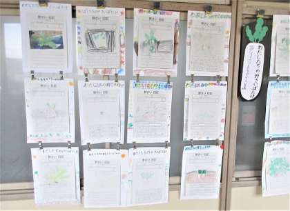 2年生が生活科で大根を育てています。観察日記の掲示です。