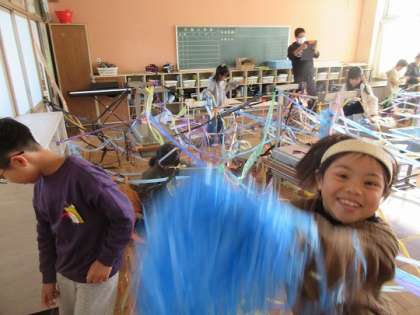 3年生 図工 公開日 2024/11/19 更新日 2024/11/19 旭東+(プラス) 3年生は図工で「ひもでつないで−ひもひもワールド−」に取り組んでいます。 教室が、大きな作品に。 子どもたちの発想は、無限大です!