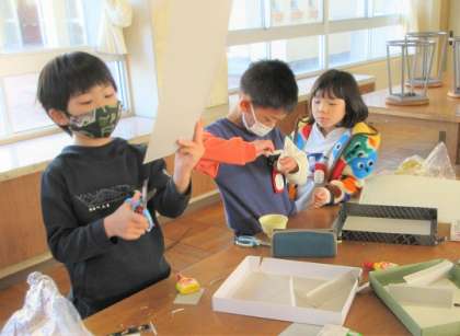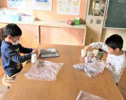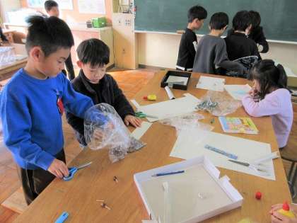 校庭で見つけた自然物を使っておもちゃを作っていました。