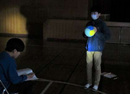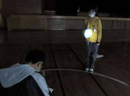 体育館でボールとライトを使って実験し、確認をしていました。