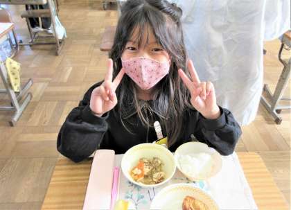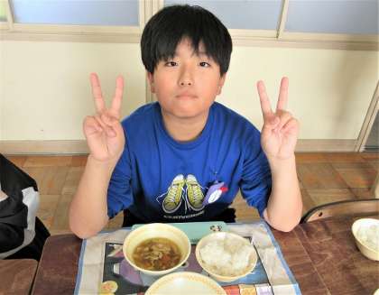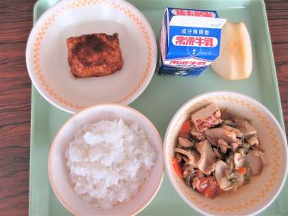 今日のメニューは、ご飯、牛乳、けんちん篠田の味噌だれかけ、ひきずり、りんごでした。