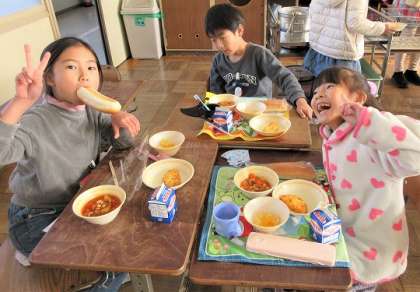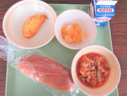 今日のメニューは、ミルクロールパン、牛乳、オムレツ、ポークビーンズ、ナタデココポンチでした。