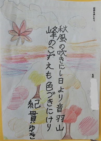 3年生の「短歌をたのしもう」の展示です。歌を味わって鑑賞画を描いています。